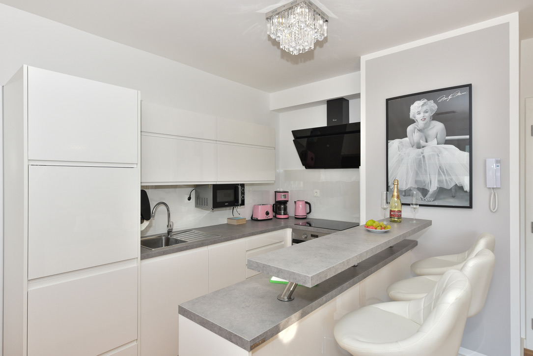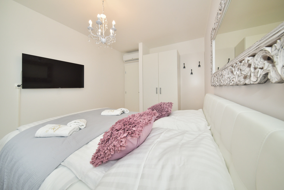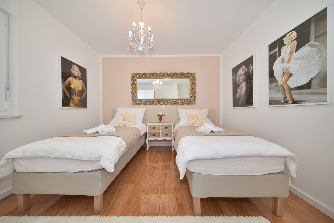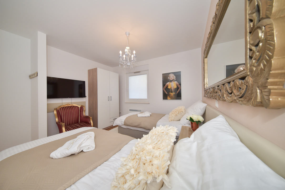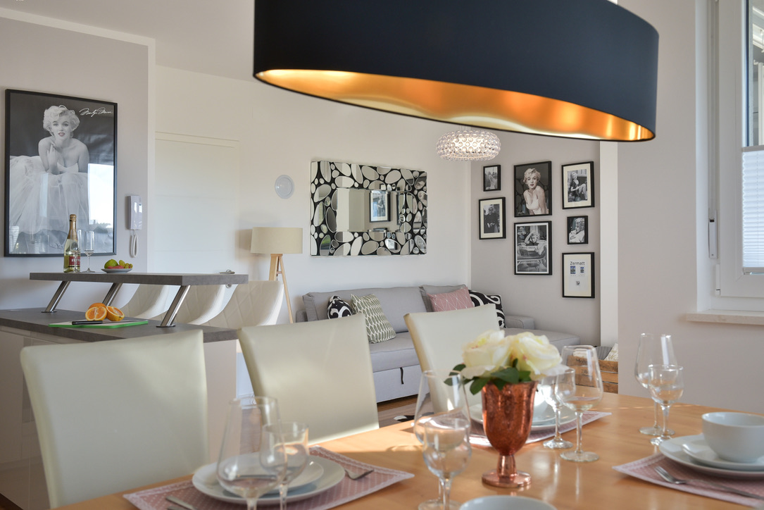 Das elegante und interessant eingerichtete Apartment Gold schafft eine besonders warme und einladende Atmosphäre mit einem Hauch von Luxus. Das Erdgeschoss Apartment besteht aus einer voll ausgestatteten Küche mit einem Essbereich, zwei getrennten Schlafzimmern und einem schönen Wohnzimmer, das sich perfekt dazu eignet einen schönen Tag ausklingen zu lassen. Im Palmengarten haben sie einen Esstisch mit Sonnenliegen zur Verfügung, von wo sie den Sonnenuntergang genießen können.