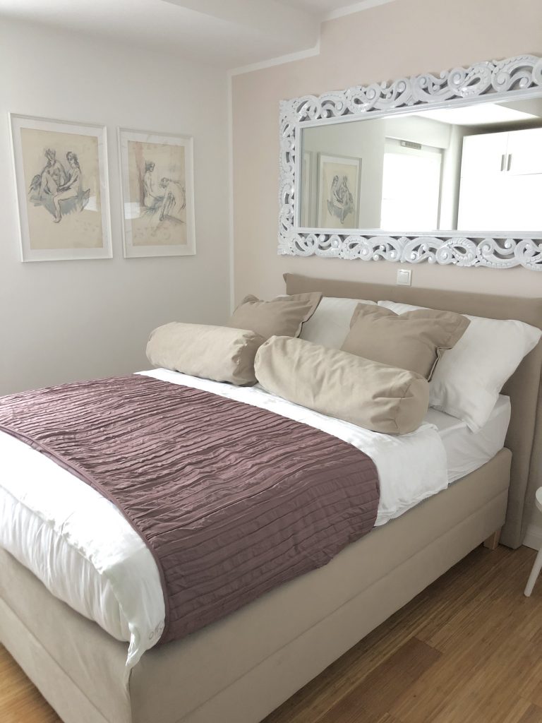 Die pastellfarbenen Schlafzimmer sind mit großen bequemen Betten ausgestattet und wird dem Gast durch die künstlerische Gestaltung ein Hauch von Luxus und Kunst vermittelt. Von beiden hat man einen direkten Blick auf das Meer.